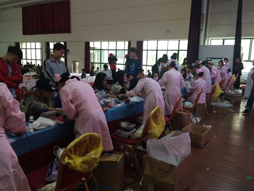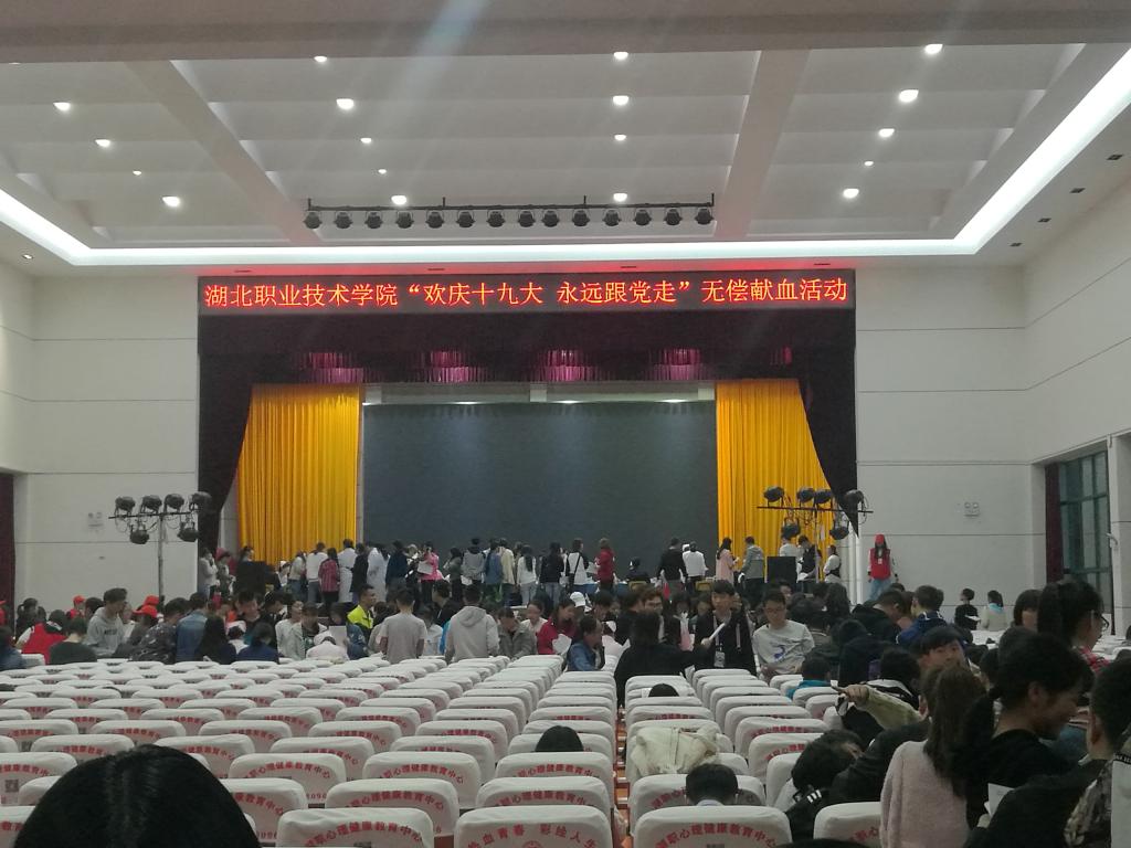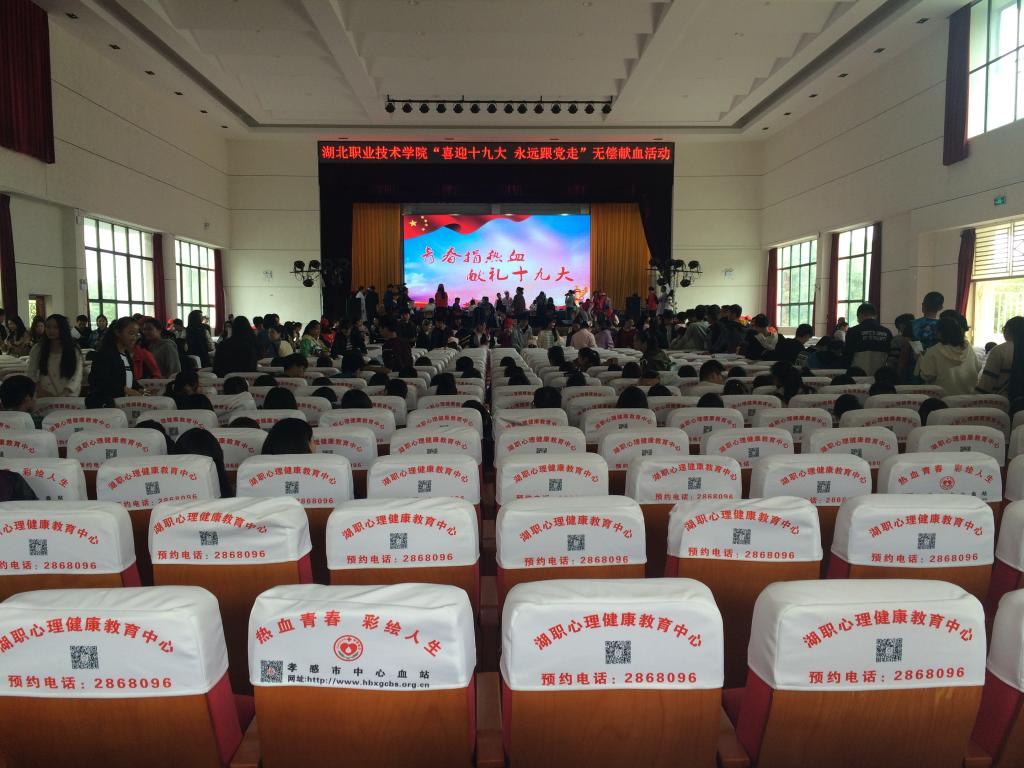 10月25日下午,阳光明媚,在全国上下欢庆党的十九大顺利闭幕、十九届一中全会顺利召开之时,学工部(处)主动联系孝感市中心血站在西区大学生活动中心开展以“欢庆十九大 永远跟党走”为主题的无偿献血活动。此次爱心献血活动吸引了广大师生的踊跃参与,参加献血的师生共计有836人,创造了学校单日献血的最高纪录,另有200多名师生的献血预约留待下周进行。