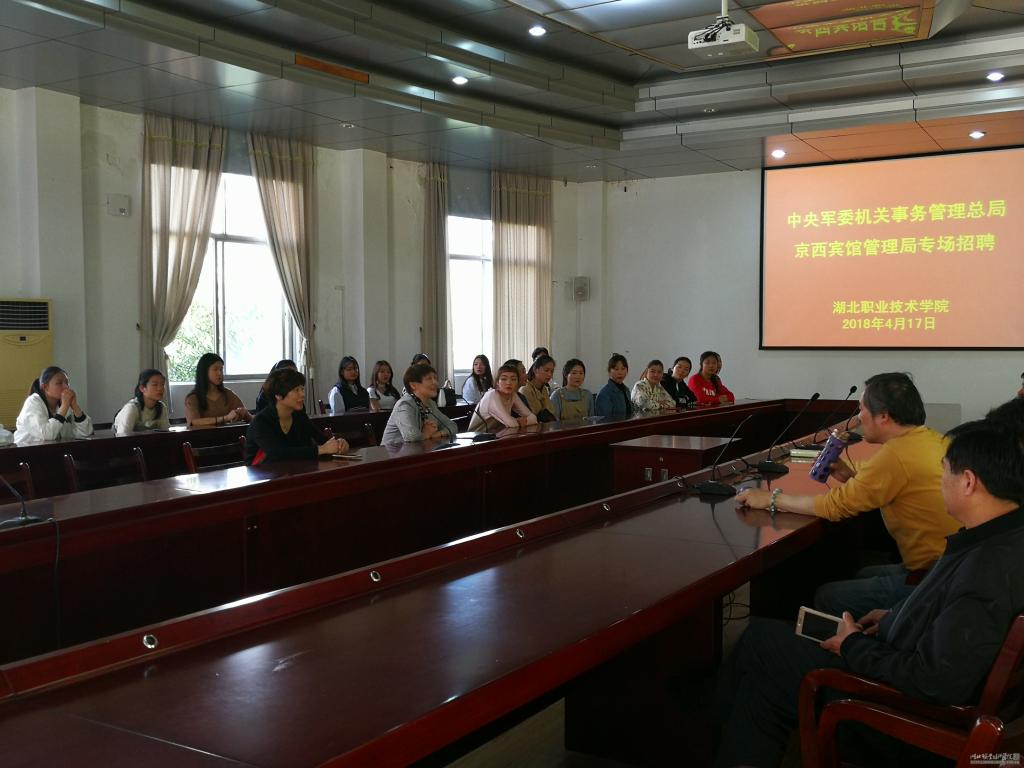 4月17日下午,隶属于中央某委机关事务管理总局的京西宾馆管理局在湖北省劳动就业管理局副局长董平的陪同下,来我校招聘大中专学生。此次专场招聘会,对学生思想政治素质、技术技能综合表现有很高要求,学校领导高度重视,校长朱虹主持召开动员会,并与副校长杨立明、就业创业部门负责人参加招聘全过程。