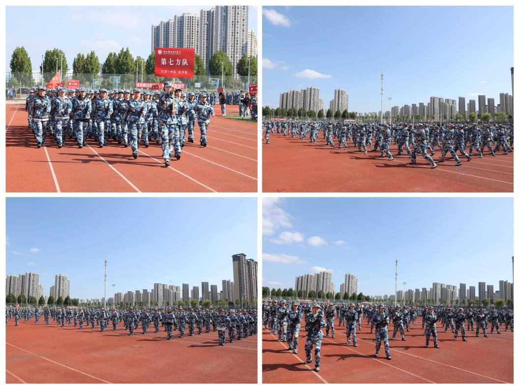 活动以雄壮的《中华人民共和国国歌》开篇,五星红旗冉冉升起,全体人员肃立行注目礼。随后军训成果汇报展开,70个新生方队依指令依次入场,身着迷彩服的新生迈着铿锵步伐、喊着洪亮口号,动作整齐划一,尽显军训成效与青春朝气。分列式后,特色表演方队登场:军体拳方队出拳如风、踢腿如雷;匕首操方队身形灵动,劈刺精准;刺杀操方队气势如虹,持枪突刺连贯有力,精彩表现赢得全场掌声。