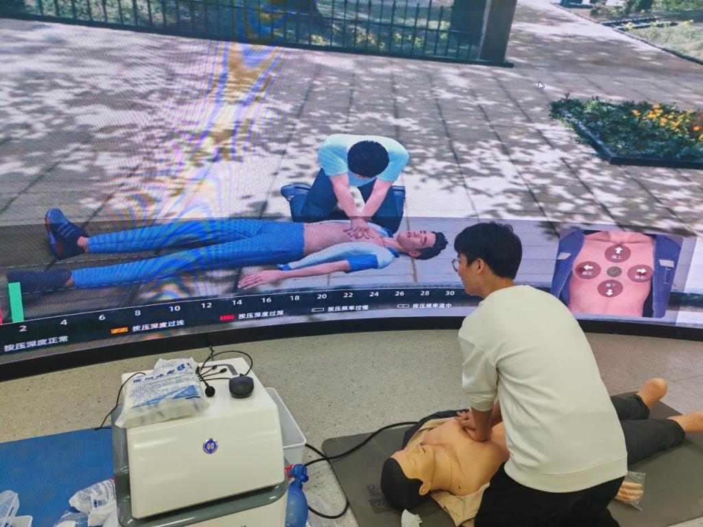 在产教融合大楼情景化急救实训室中,学生们围站在模拟人旁,认真练习心肺复苏、AED使用和创伤包扎。节奏清晰的按压声与教师的指导声交织在一起。建筑工程学院的一名学生擦着汗说:“以前只在视频里看过,现在反复实操后,才真正理解黄金救援时间的意义。这门课让我学到了能真正救命的技能,心里更有底气了。”
