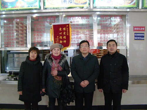 1月12日下午,一个特殊授锦旗仪式在学校东区食堂一楼举行,副校长梅重代表学校向襄阳牛肉面档口经营负责人授予锦旗,感谢她本学期以来对8名贫困学子的默默资助,学校学工处、后勤服务中心等部门相关负责人等参加了授旗仪式。