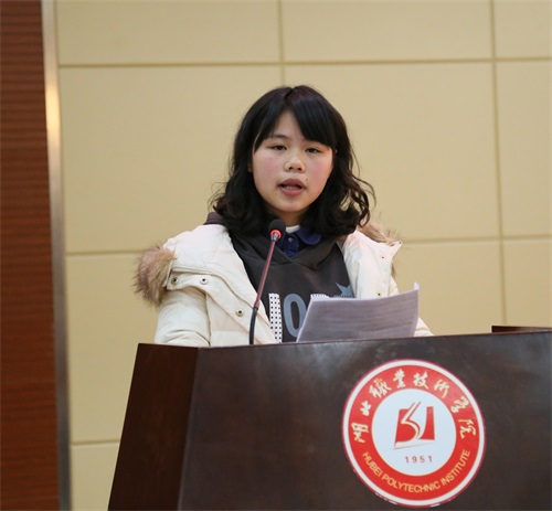 “身边的感动”事迹宣讲环节,来自学校各二级教学院的六位孝德标兵代表分别结合自身的经历、发生在自己身边的平凡事、生活中的点滴等,同大家分享了自己的感动故事。来自医学院的王少华同学,以《爱的真谛》为主题,用朴实的语言,饱含深情讲述了自己在亲人和医学院师生的关爱与支持下,与病魔抗争、绝不言弃的“爱”的感言,同时向所有关心、支持、帮助过他的人表达了无限的感激之情;财经学院的梁映婵以《感恩生命,自强不息》为主题,结合自身经历,激励95后同学要学会感恩、珍爱生命、自强不息;校新闻中心向友坤同学以《将敬业刻在心底》为主题,讲述了学校关工委常务副主任、退休老教师左德汉一辈子的敬业、奉献的故事,左老一辈子以实际行动践行自己的人生誓言,传递孝德力量,践行社会真善美,传承孝德精神,使大家感同身受、受益匪浅;来自护理学院的彭晨曦以《学会感恩,争做孝德青年》为主题和大家交流了用专业知识开展“孝心”护理志愿服务,传承孝德文化、培育科学青春价值观,传递孝德力量、践行社会真善美,传承孝德精神、实现青春梦想等方面的体会;建筑技术学院冯高龙同学以《在奉献中收获快乐》为主题,讲述自己坚持不懈开展青年志愿服务,用实际行动诠释了奉献自我、收获快乐的真情实感;信息技术学院杨永康同学以《传承美德当孝子,一专多能当义工》为主题,结合亲身经历,分享了如何以我校余志凌老师等先进典型为榜样,如何感恩父母、感恩社会、感恩生活的故事,他的经历告诉我们,只有常怀一颗感恩的心,才能让感恩成为一种习惯,才能让习惯成为一种自然。六位宣讲同学以自身、或发生在身边的平凡事迹,继承并弘扬中华民族的传统美德,将感恩之举、孝德之为在学习生活中体现得淋漓尽致。