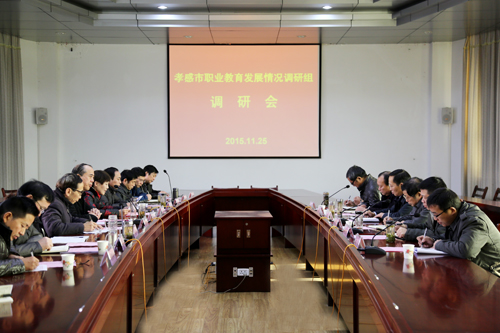 校长朱虹从近期主要工作、招生就业、经费保障、实训条件、发展困难等方面进行了汇报,对孝感市职业教育的发展提出了相关意见与建议。朱校长指出,学校制定并实施了 “四个”全面的战略部署,即以提高人才培养质量为核心,全面提升办学水平;坚持依法办学,全面提高学校管理水平;全面深化改革,不断增强学校发展的动力和活力;全面加强党的建设,为学校科学发展提供坚定的组织保障。学校近期工作成效明显,师生在各级技能大赛中频频获奖,依法治校水平进一步提升,新生报到率及学生就业率再创新高,积极探索“3+2”本科人才培养模式,凝心聚力,科学谋划“十三五”。朱校长恳请市调研组呼吁各级政府进一步加大支持力度,帮助解决学校建设发展的困境,促进我市职业教育再上新台阶。
