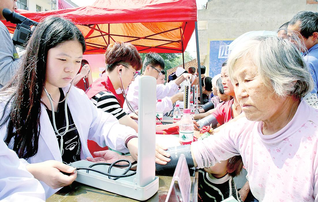 5月25日,湖北职业技术学院的专家教授和医护人员为汉川市回龙镇新桥村村民免费体检。当日,该院在精准扶贫点新桥村开展“科普周·社科专家乡镇行”活动,在义诊的同时,还开展了科普活动。(记者 匡文杰 摄)