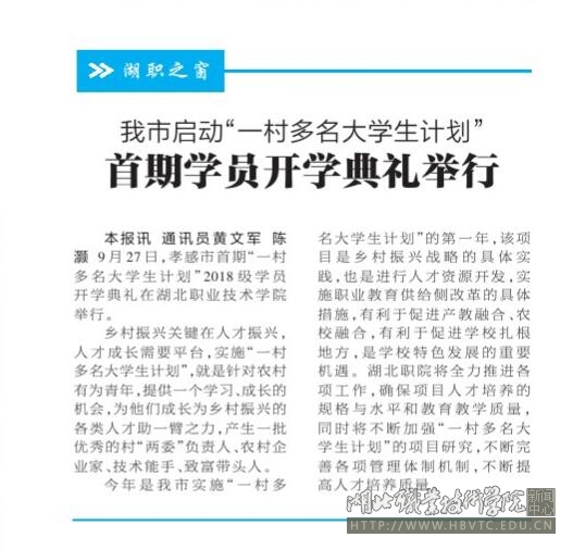 9月27日,孝感市首期“一村多名大学生计划”2018级学员开学典礼在湖北职业技术学院举行。
