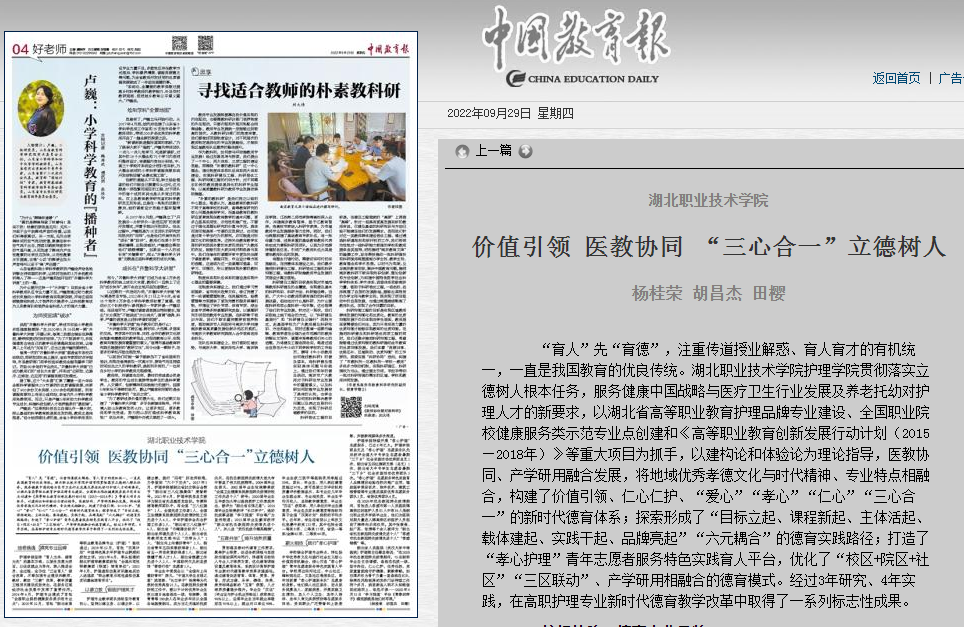 “育人”先“育德”,注重传道授业解惑、育人育才的有机统一,一直是我国教育的优良传统。湖北职业技术学院护理学院贯彻落实立德树人根本任务,服务健康中国战略与医疗卫生行业发展及养老托幼对护理人才的新要求,以湖北省高等职业教育护理品牌专业建设、全国职业院校健康服务类示范专业点创建和《高等职业教育创新发展行动计划(2015—2018年)》等重大项目为抓手,以建构论和体验论为理论指导,医教协同、产学研用融合发展,将地域优秀孝德文化与时代精神、专业特点相融合,构建了价值引领、仁心仁护、“爱心”“孝心”“仁心”“三心合一”的新时代德育体系;探索形成了“目标立起、课程新起、主体活起、载体建起、实践干起、品牌亮起”“六元耦合”的德育实践路径;打造了“孝心护理”青年志愿者服务特色实践育人平台,优化了“校区+院区+社区”“三区联动”、产学研用相融合的德育模式。经过3年研究、4年实践,在高职护理专业新时代德育教学改革中取得了一系列标志性成果。