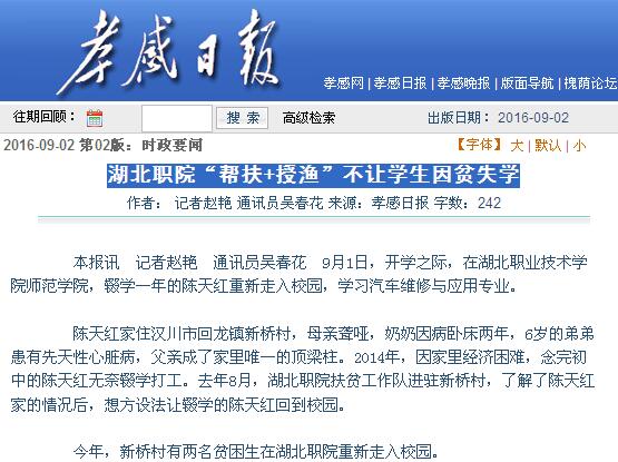 【孝感日报】湖北职院“帮扶+授渔”不让学生因贫失学