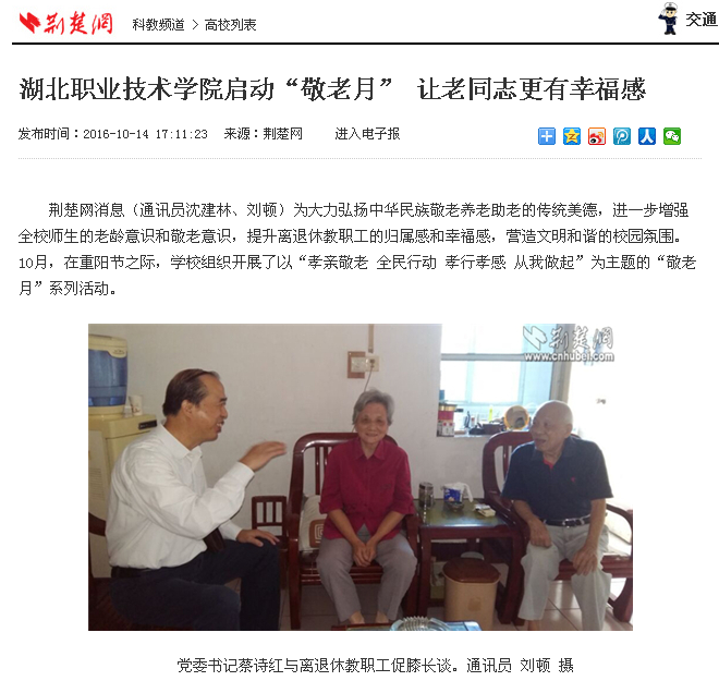 为大力弘扬中华民族敬老养老助老的传统美德,进一步增强全校师生的老龄意识和敬老意识,提升离退休教职工的归属感和幸福感,营造文明和谐的校园氛围。10月,在重阳节之际,学校组织开展了以“孝亲敬老 全民行动 孝行孝感 从我做起”为主题的“敬老月”系列活动。