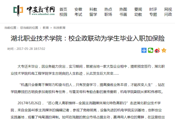 【中安教育网】湖北职业技术学院:校企政联动为学生毕业入职加保险