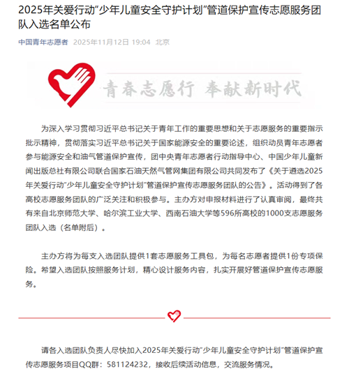 据了解,本次遴选活动由团中央青年志愿者行动指导中心、中国少年儿童新闻出版总社有限公司联合国家石油天然气管网集团有限公司共同发起,旨在深入学习贯彻习近平总书记关于青年工作的重要思想和关于志愿服务的重要指示批示精神,贯彻落实习近平总书记关于国家能源安全的重要论述,组织动员青年志愿者参与能源安全和油气管道保护宣传。活动得到了各高校志愿服务团队的广泛关注和积极参与,经过激烈的角逐与严格的遴选,财旅“锋”华正茂志愿服务队同北京师范大学等596所高校的1000支志愿服务团队入选,主办方将为每支入选团队提供1套志愿服务工具包,为每名志愿者提供1份专项保险。