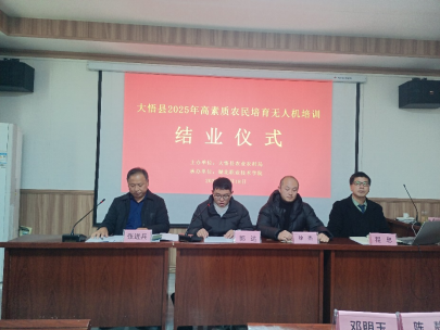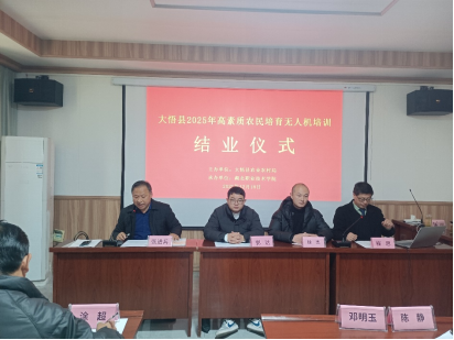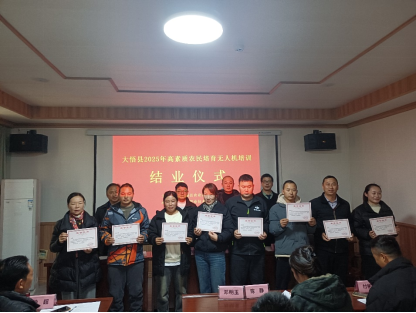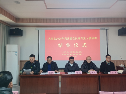 (本网讯 杨丹)12月18日,由大悟县农业农村局主办、我校教育与艺术学院承办的“大悟县2025年高素质农民教育培育项目农机手(无人机)专题培训班”结业仪式在大悟县新城镇金岭村举行。50名参训学员圆满完成各项学习任务,顺利结业,并成功考取农用无人驾驶航空器操作证,为大悟县现代农业发展注入了新的技术动能。