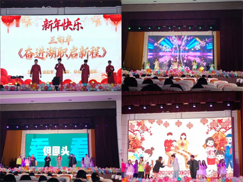 “浩歌向前·赴未来”篇章,三句半《奋进湖职启新程》昂扬响起,引发深切共鸣;舞蹈《Good Time》用跃动的节拍引爆全场热情;压轴的歌舞串烧《像我们这样的团队》则以师生澎湃的合力,为整场演出华彩收官。
